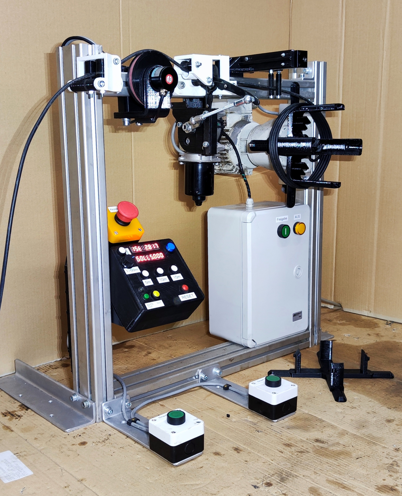 A custom built system that winds and cuts cable to a specified length. It is used for automating the repetitive process of creating multiple smaller cable packages from large 500 m spools for redistribution.