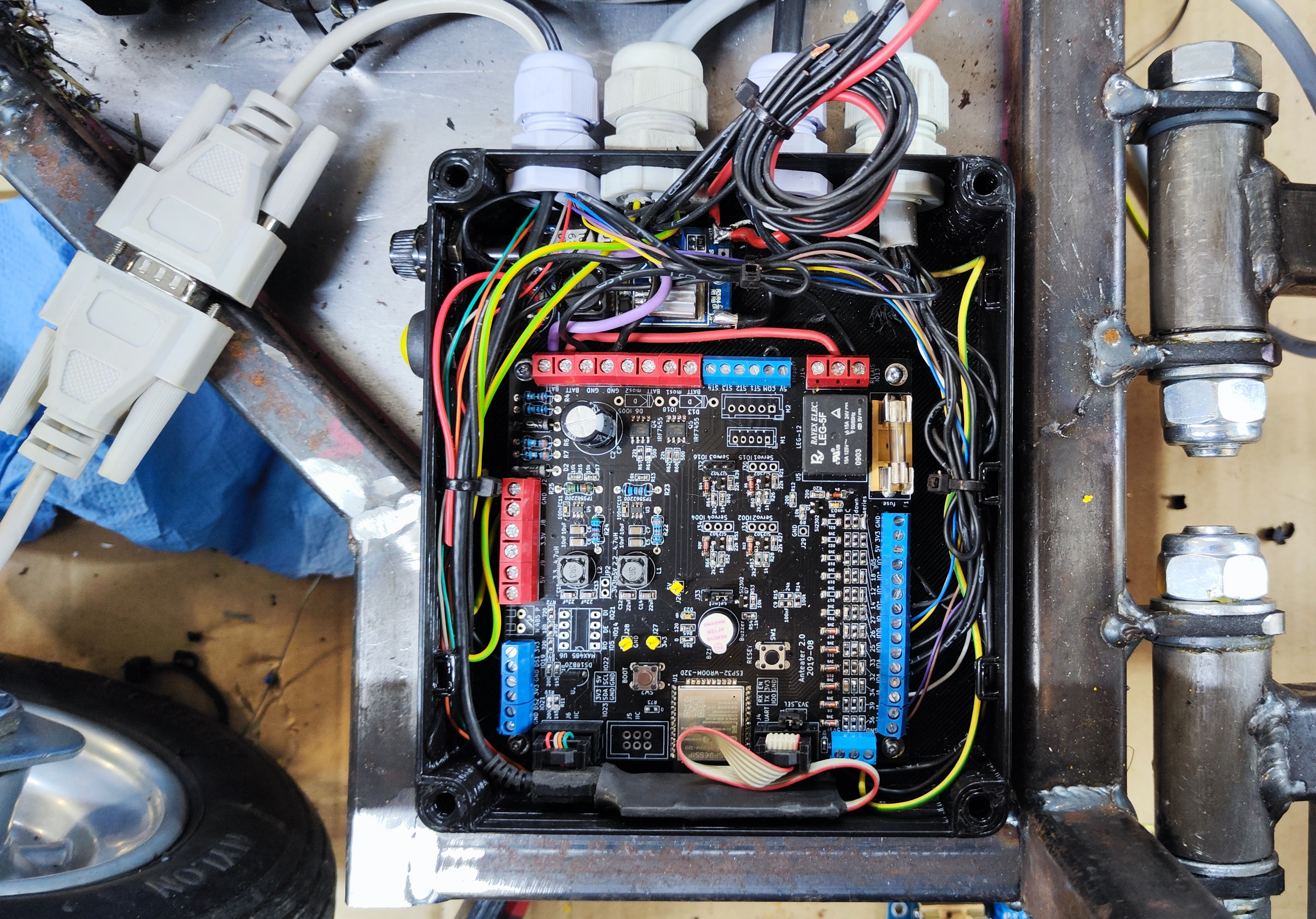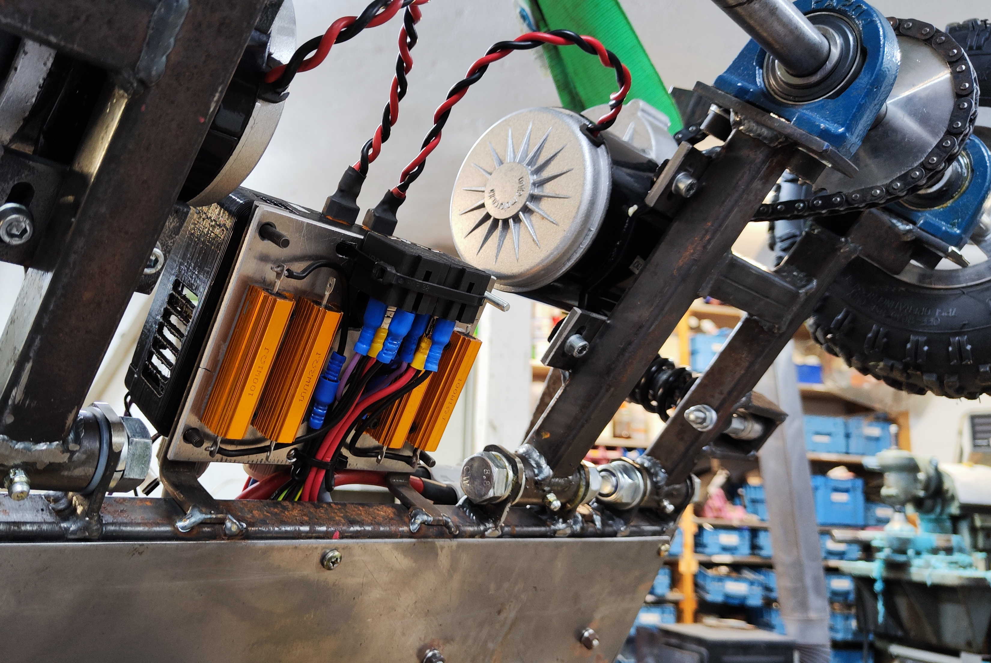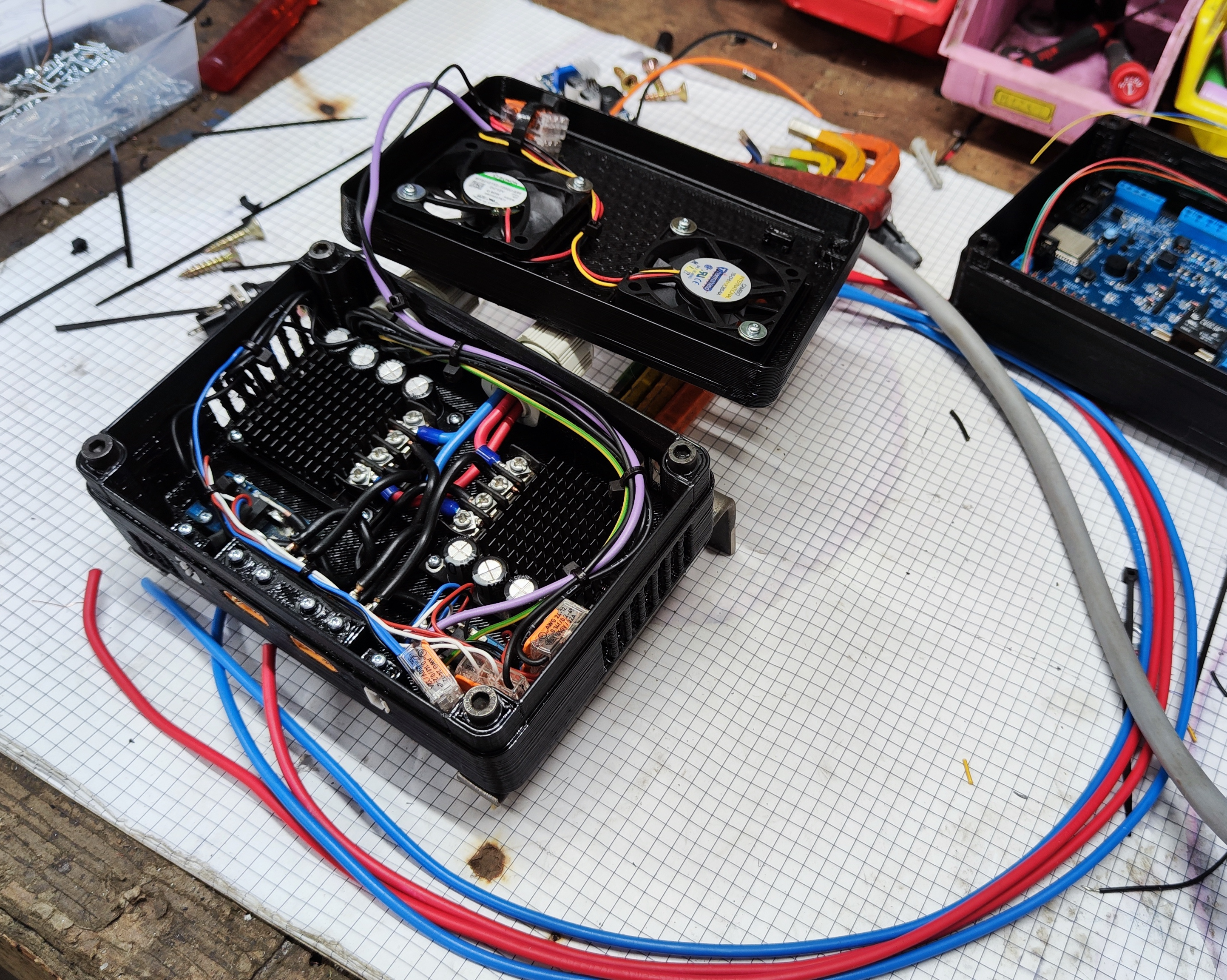 A switch to a more powerful dual-channel motor driver (2 x 60 A) was made. It is controlled via a single-pin serial interface (RS232). This switch made the second board and braking resistors obsolete.