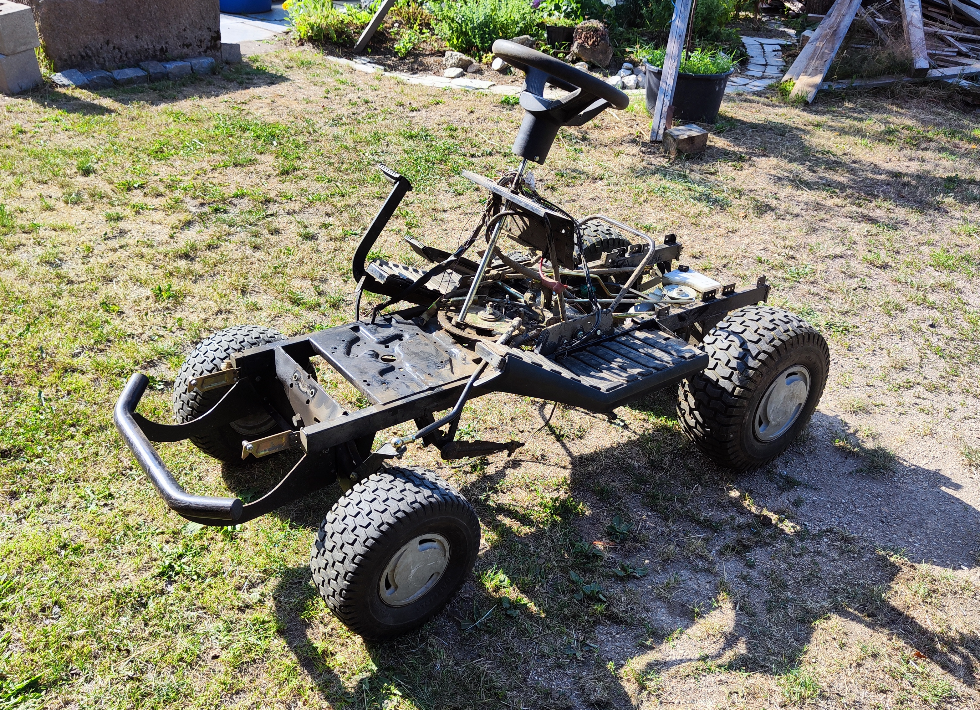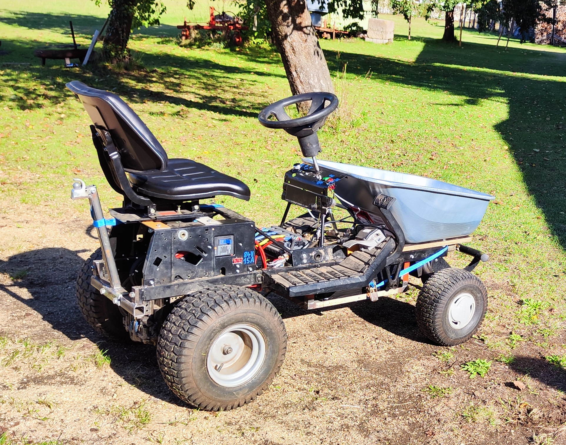 The engine of a 10-year-old lawn tractor was damaged beyond repair and a new tractor purchased. Rather than simply discarding the old tractor, this project was born to use the chassis and transmission of the tractor and convert it into an versatile electric vehicle for use around the garden, giving it a new purpose.