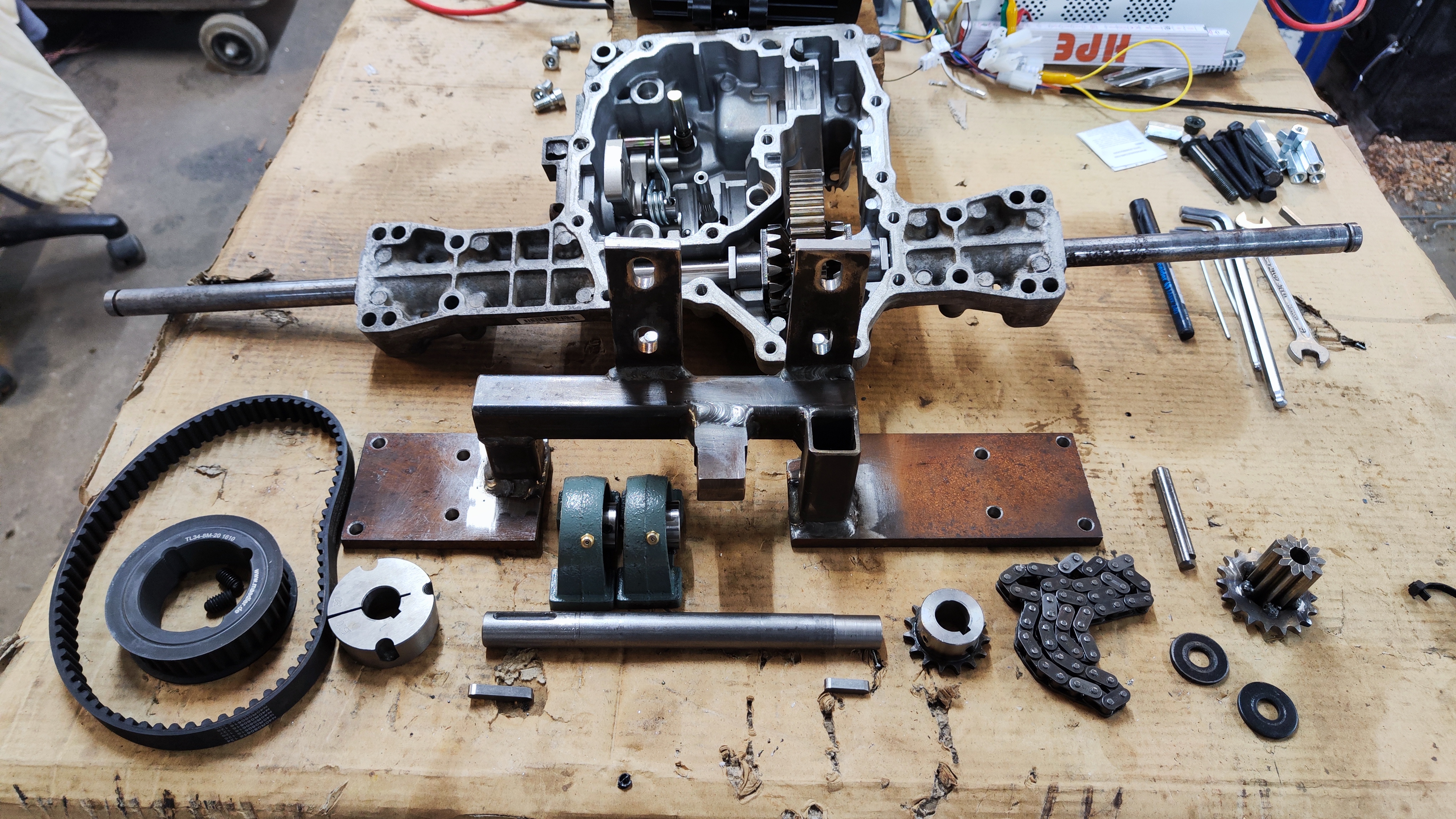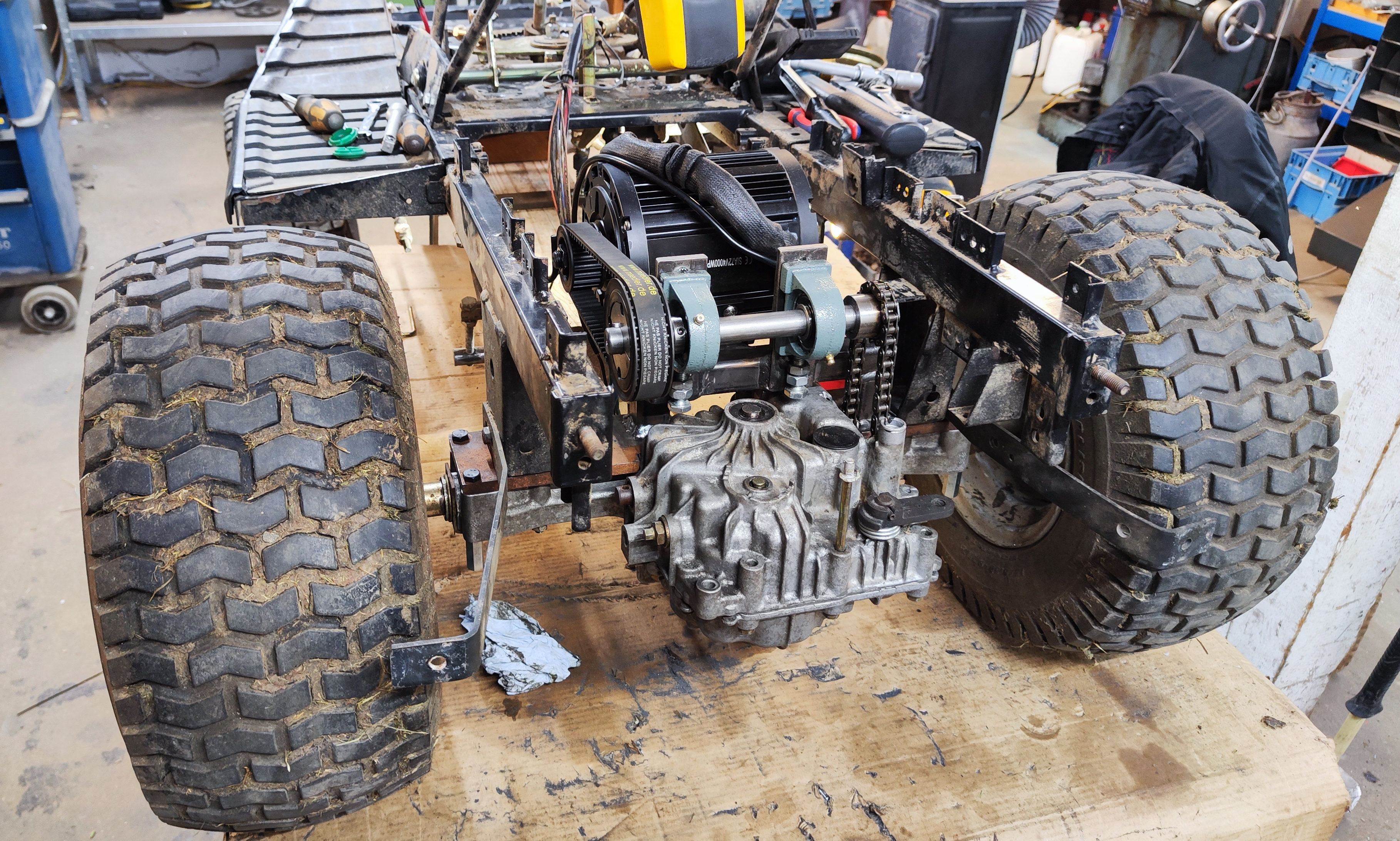 - Custom intermediate shaft connecting motor to old hydrostatic transmission, utilizing the differential
