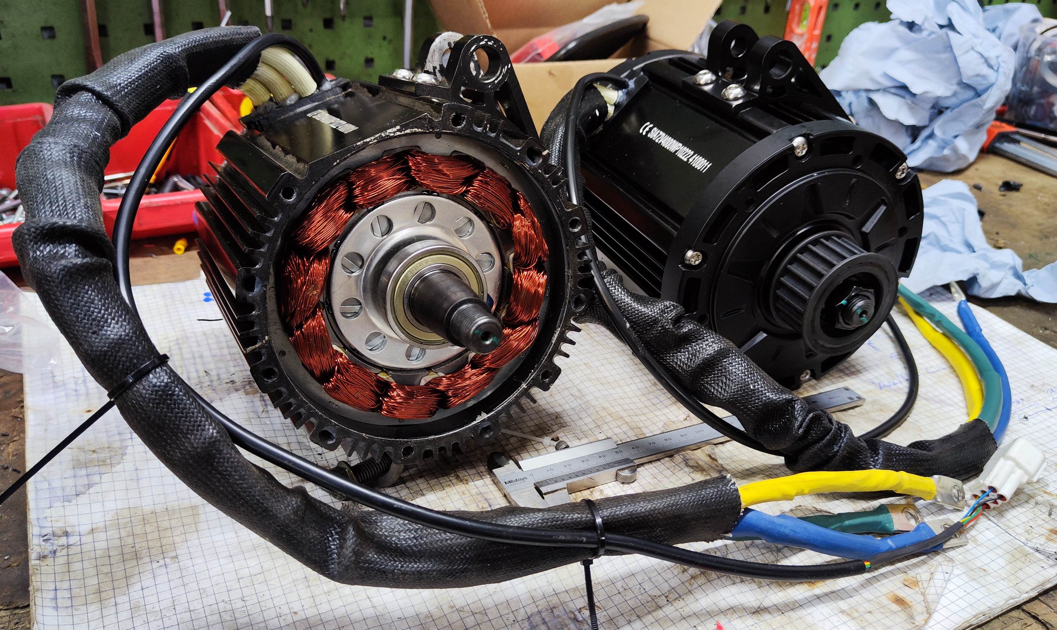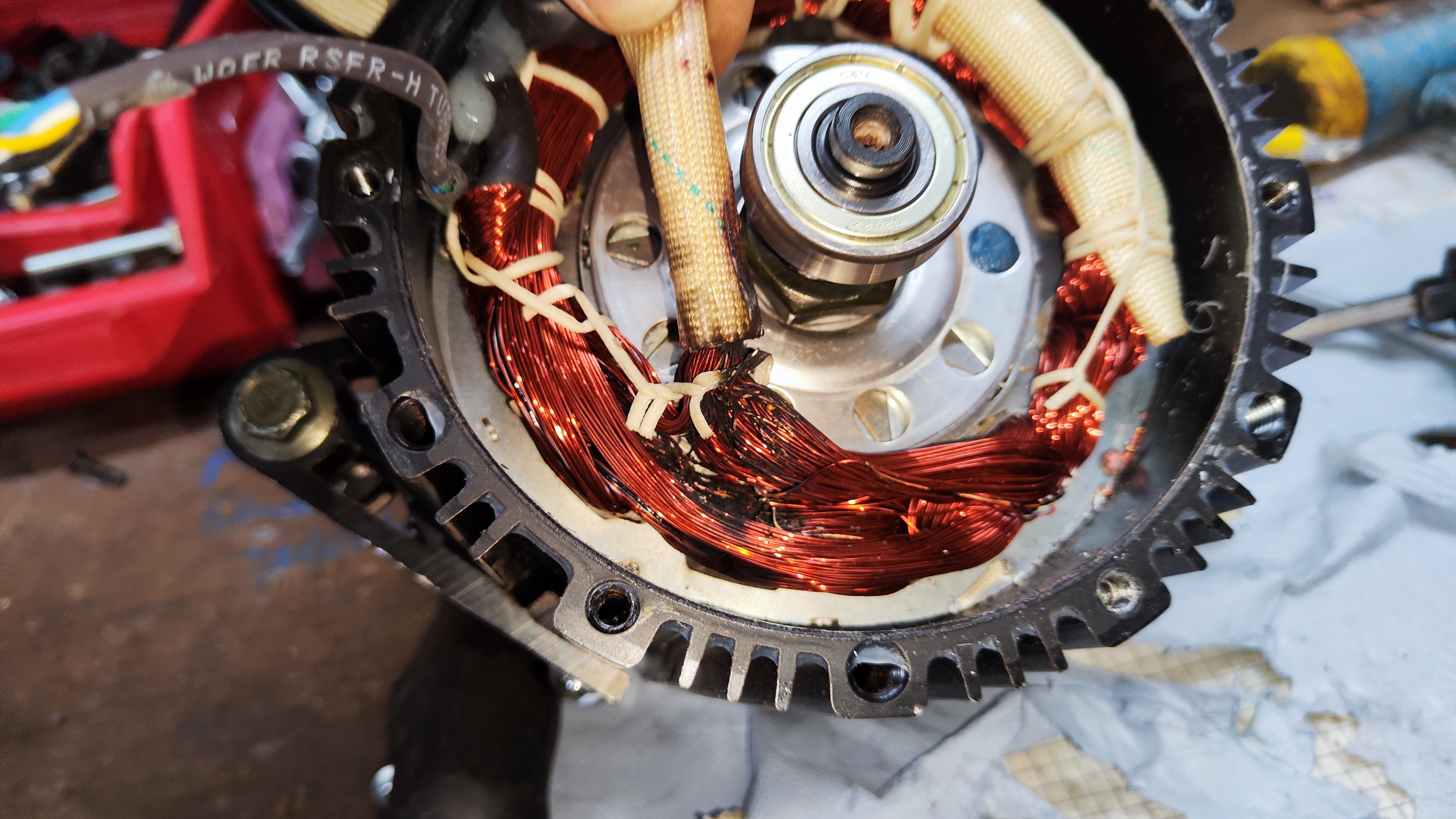 During the first few test runs, the motor started vibrating abnormally and quickly overheating. After trying various controller settings and running diagnostics, I decided to open the motor. It turned out that several windings were burnt and partially shorted, which caused excessive heat as the shorted windings constantly applied braking force every revolution, resulting in high current flowing to the terminals and back into the motor.