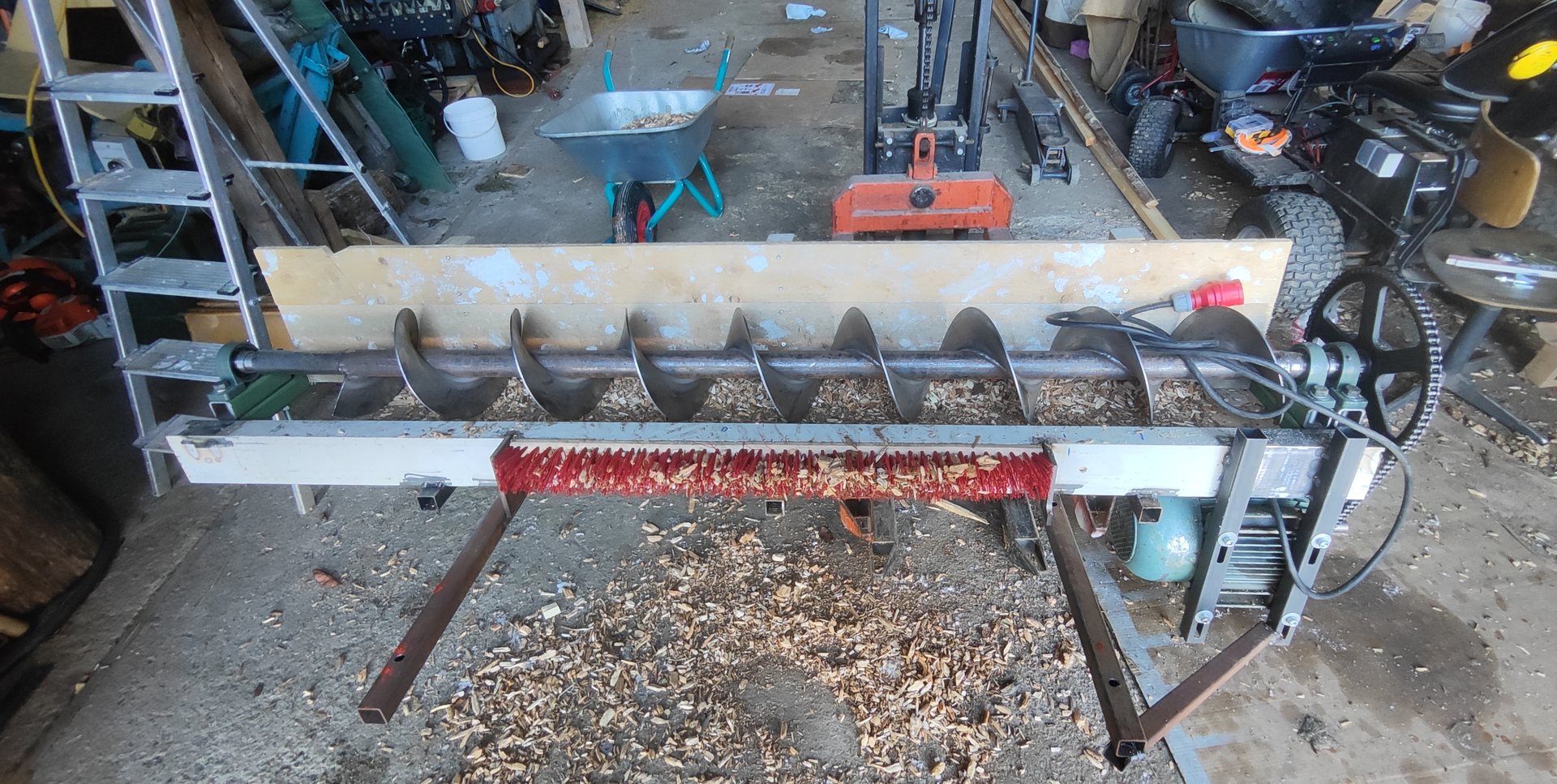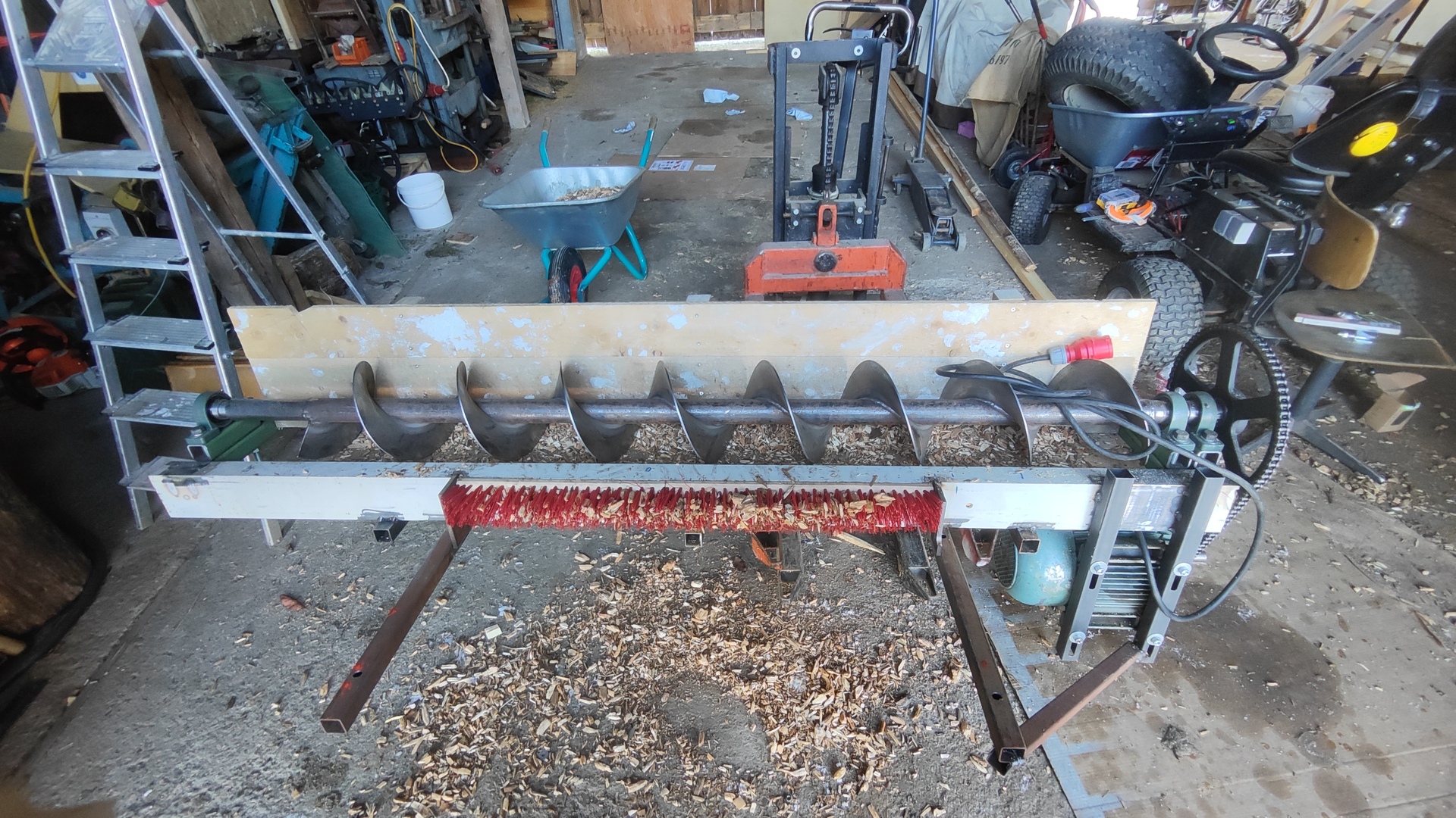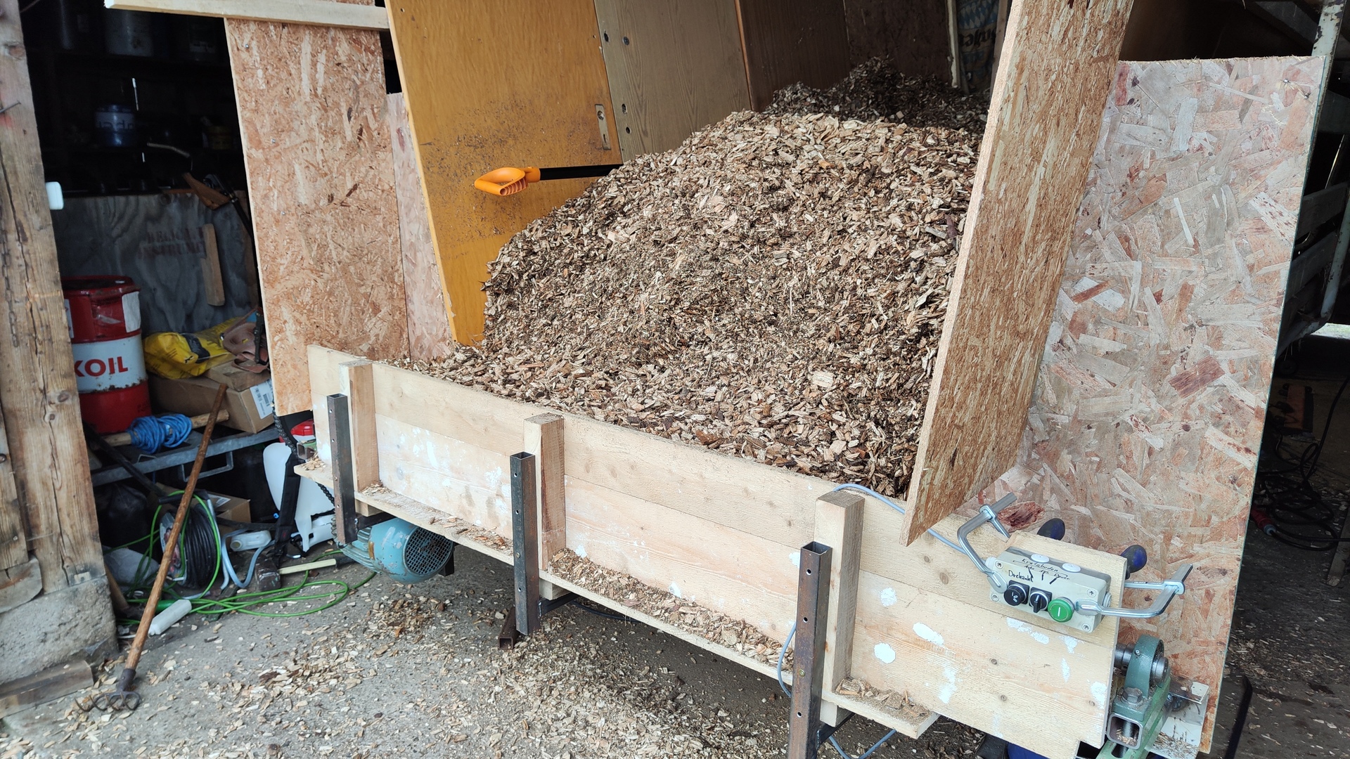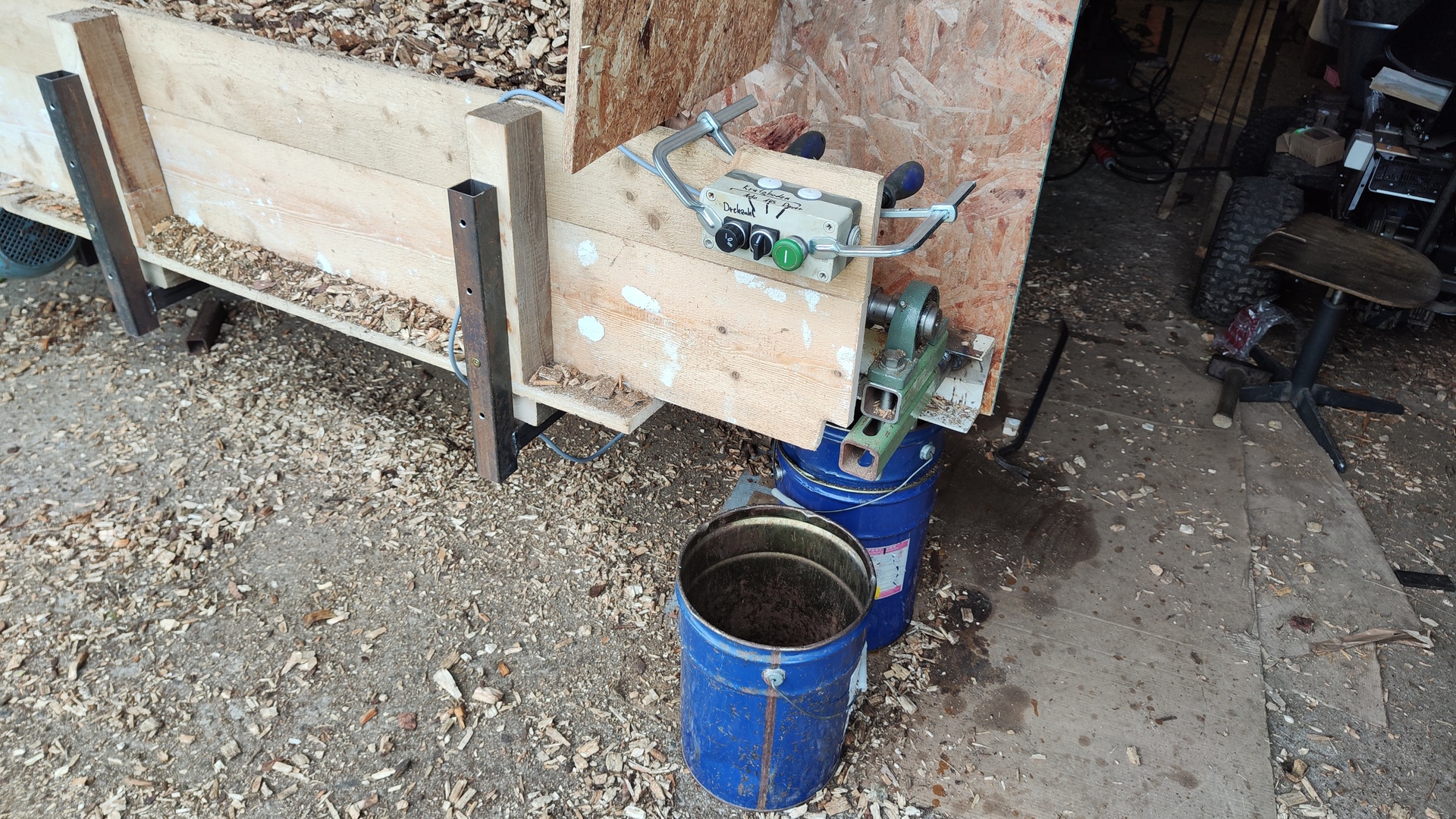 We don’t have a chip-fired heating system yet, but we still wanted to use some chips alongside firewood. The workaround was to dump chips on the floor and fill buckets by hand once a week (about ~25 buckets in one session). It worked, but only as a temporary workaround.