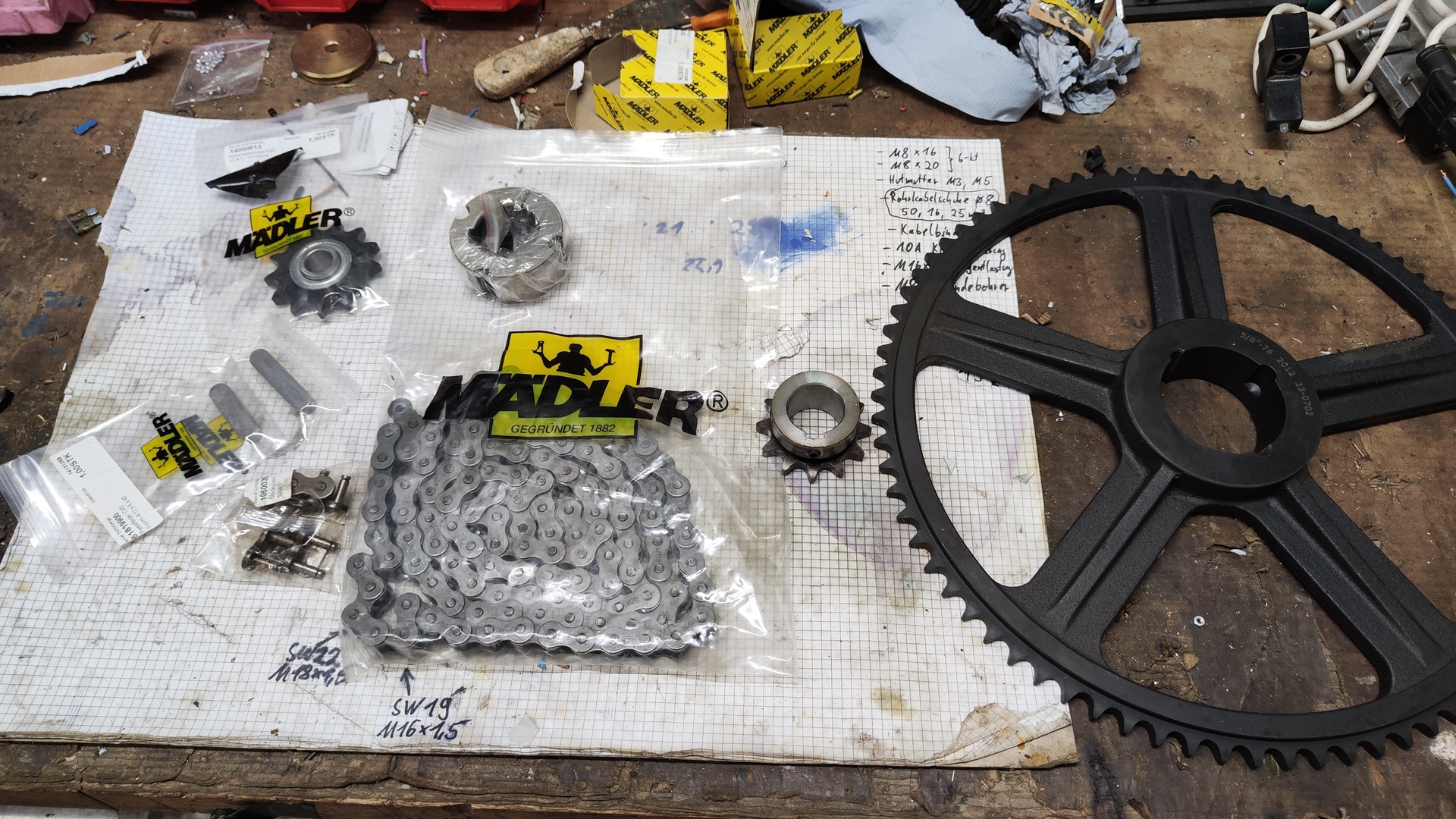 A small spreadsheet was used to try different motor/ratio/chain options with available and bought parts, the final choices are highlighted.