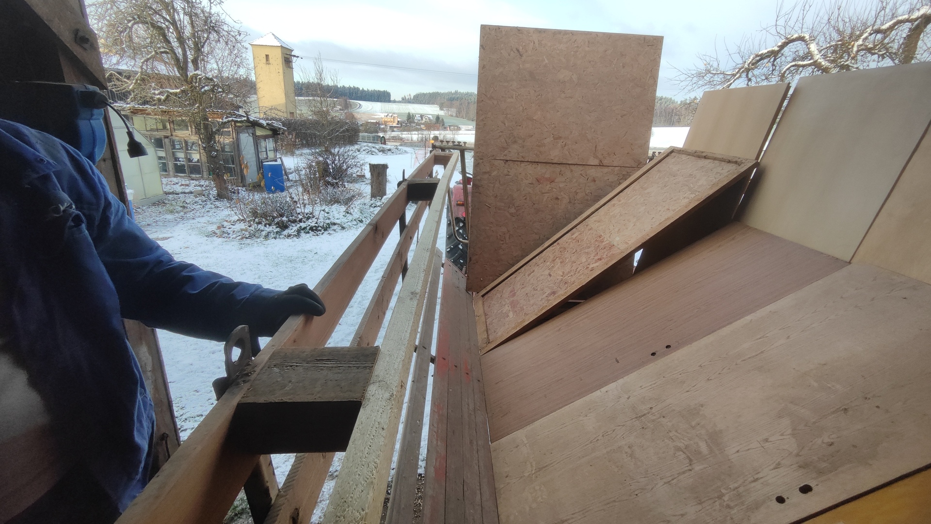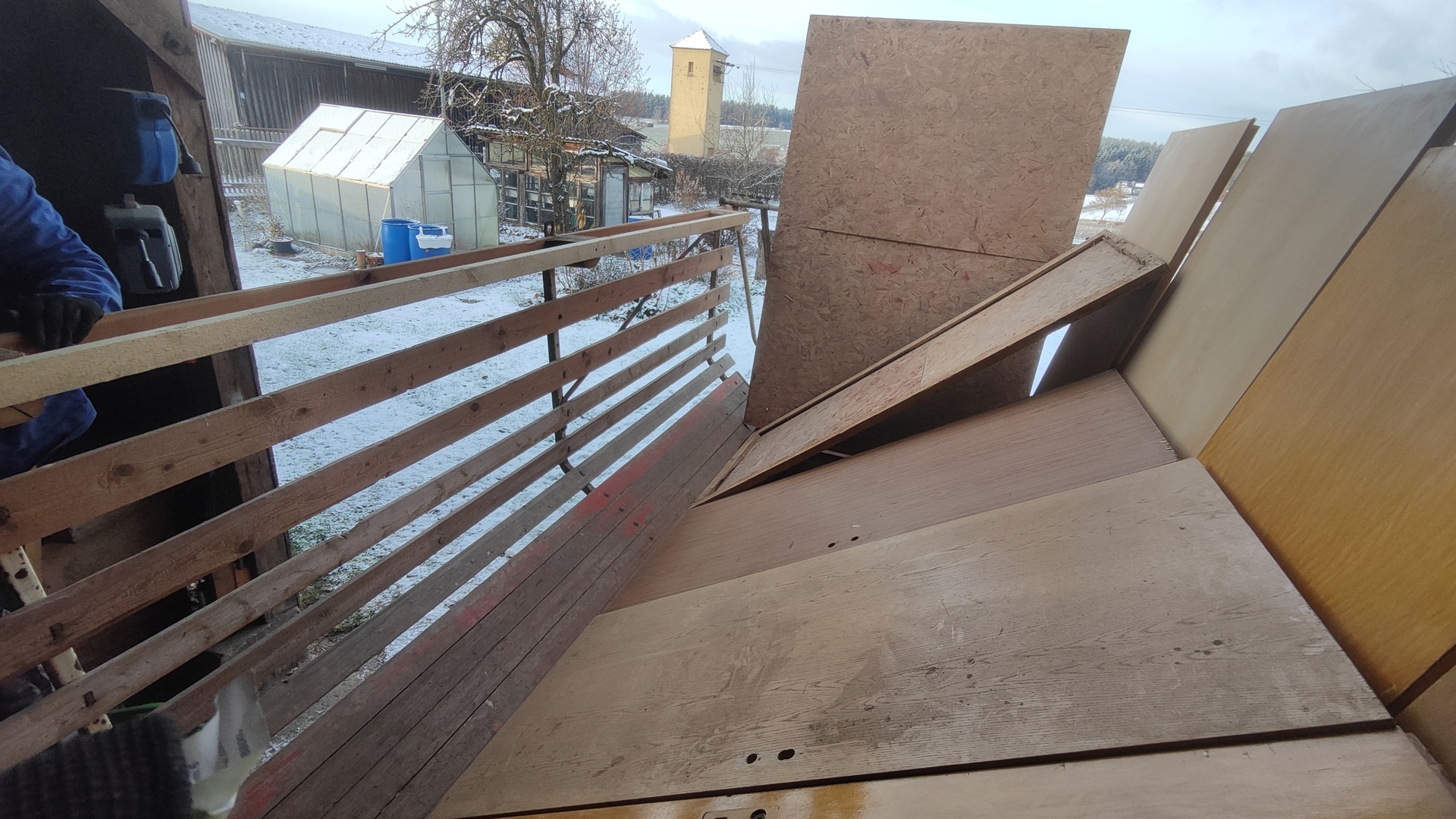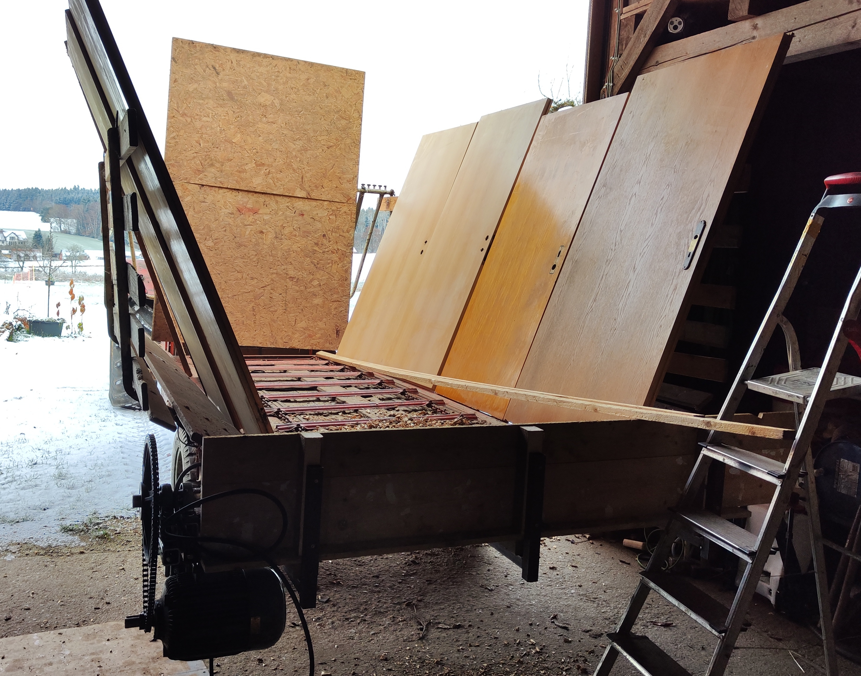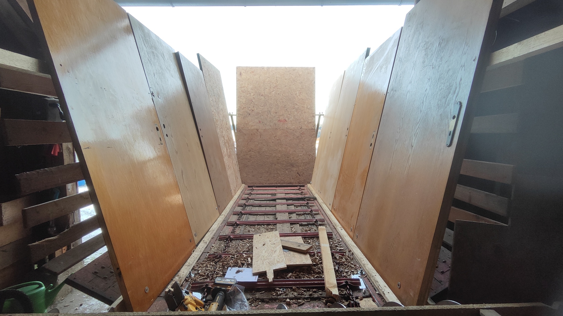 - 8× reclaimed wooden interior doors + OSB panels for side wall paneling (chip-tight)