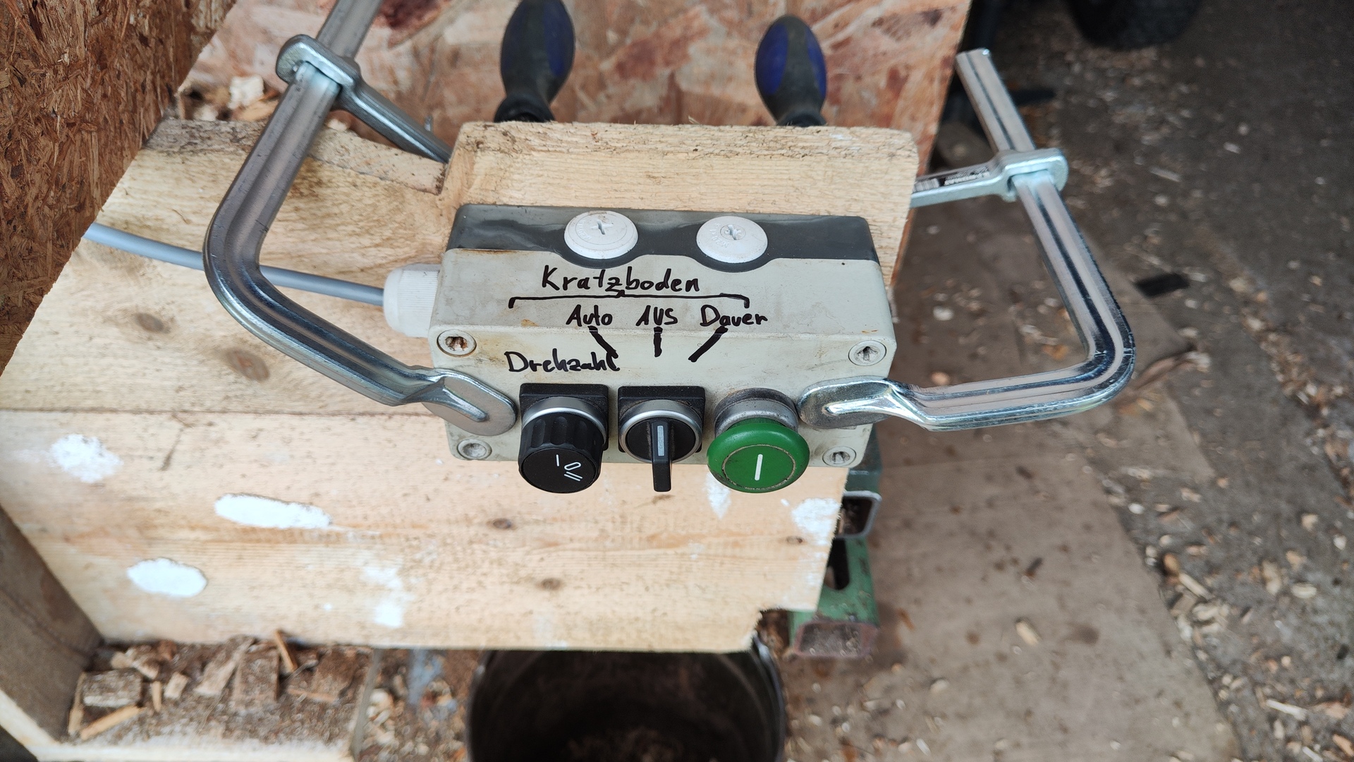- Controls: Run (auger), AUTO/MAN (scraper), scraper speed